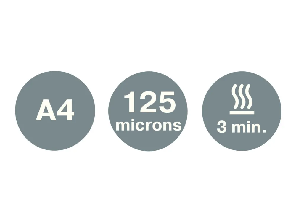 - Brings style to you home office in a range of WOW metallic colours; - Hassle free laminating with excellent results, no complicated settings; - Ready to use in 3 minutes - no more long waits to reach operating temperature; - Low energy consumption, auto shut-off when the device isn't used for 30 minutes; - For 80 to 125 microns; - Takes approximately 60 seconds to laminate one 80 micron A4 sheet; - LED ready lights and audible alert; - Includes free pouches starter kit.