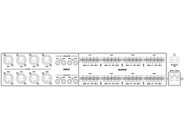 Monacor PA-1850S ELA-vahvistin8x 50 W RMS - Class-D-konsepti korkealla hyötysuhteella energiakustannusten alentamiseksi - hätäverkkokäyttöön tarvitaan vähemmän akkukapasiteettia kuin analogisilla 100 V vahvistimilla - jäähdytystehon tarve vähenee merkittävästi alhaisen lämpöhäviön ansiosta - ei melua tuulettimettoman jäähdytyskonseptin ansiosta - Mykistystoiminto kanavakohtaisesti - tasonsäätö kanavakohtaisesti - Clip- ja Protect PRO-kanavaparin LED-merkkivalo - suojattu oikosulkusuojauksella - verkkovirta- tai 24 V:n hätäverkkokäyttö. Ela-kokoonpanon 8 kanavan digitaalinen vahvistin