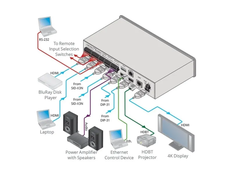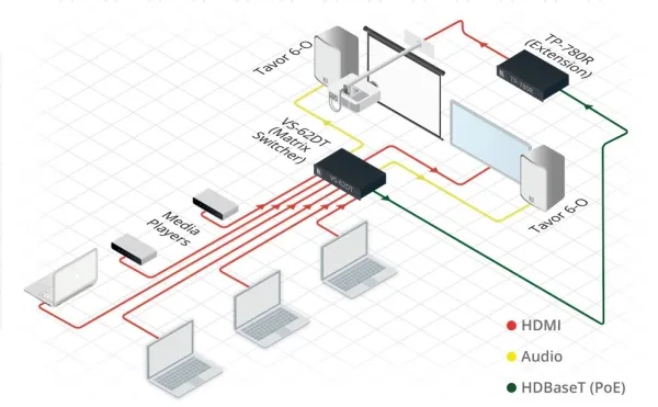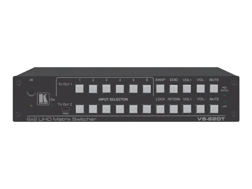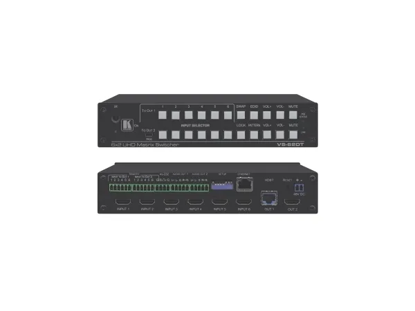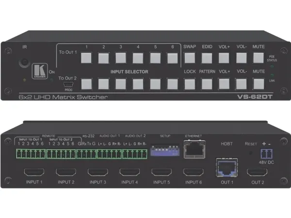 The VS-62DT is a 6x2 4K@60Hz (4:2:0) HDMI/HDBaseT matrix switcher with HDMI and HDBaseT output transmitters that provide long reach video and audio transmission. It supports resolutions of up to 4K@60Hz (4:2:0) and WUXGA. The matrix is a PoE provider that provides power over Ethernet to compatible PoE receivers.