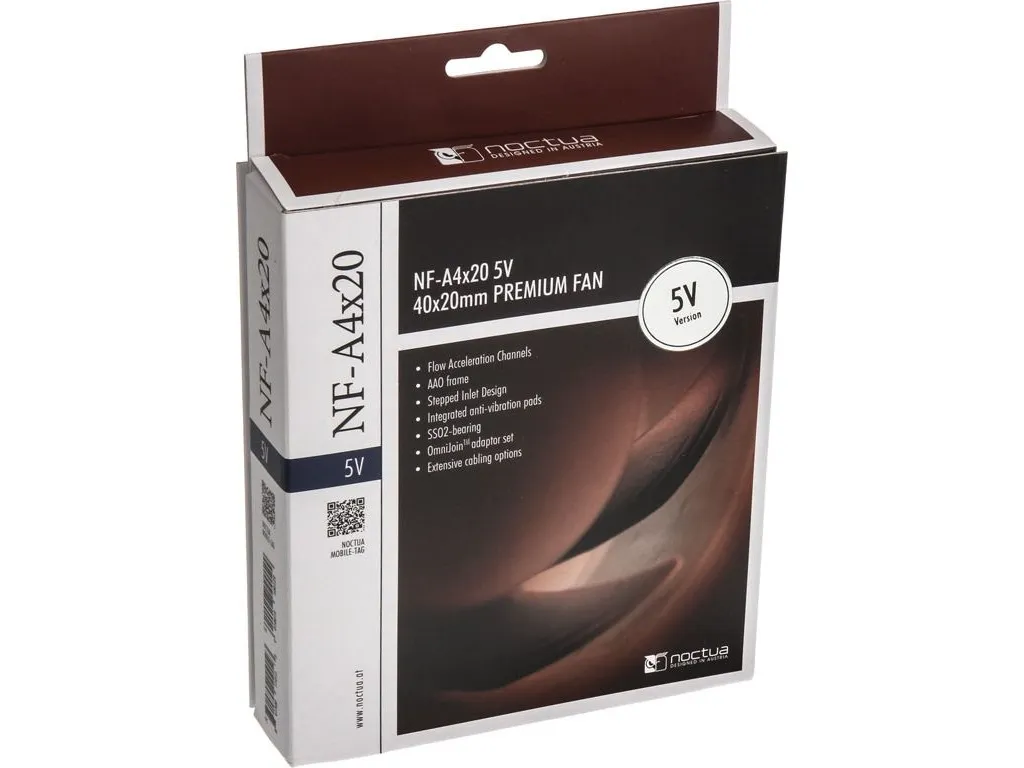Featuring advanced aerodynamic design measures such as flow acceleration channels and Noctua's AAO frame, the NF-A4x20 5V is a dedicated 5V version of Noctua's highly optimized, premium quality quiet fan. Smooth Commutation Drive technology and Noctua's reference class SSO2 bearings guarantee superb running smoothness and excellent long-term stability.