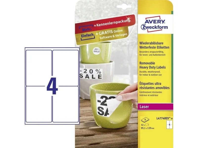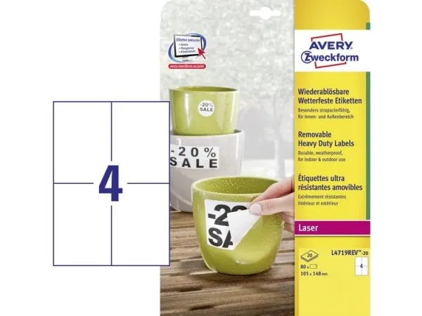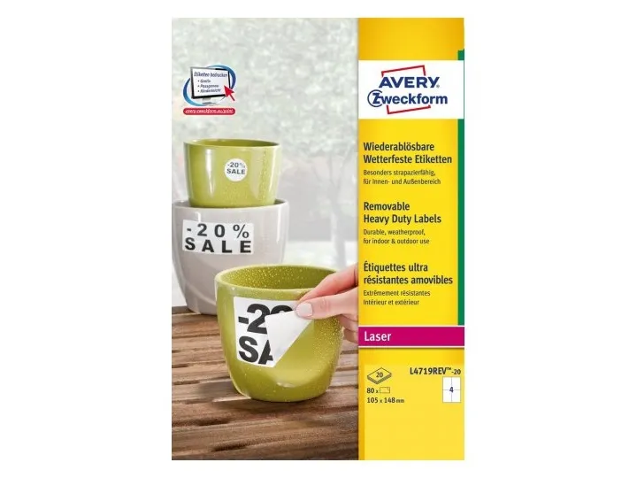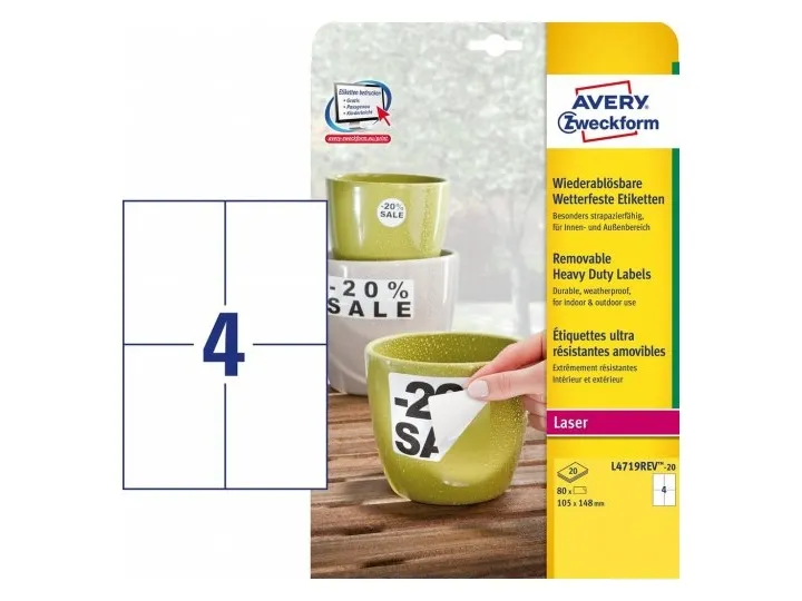 Avery L4719REV-20. Product colour: White, Label type: Self-adhesive printer label, Format: A4. Doesn't contain: PVC. Label width: 10.5 cm, Label height: 14.8 cm, Sheet width: 21 cm. Labels per pack: 80 pc(s), Media sheets per package: 20 sheets, Labels per sheet: 4 pc(s)