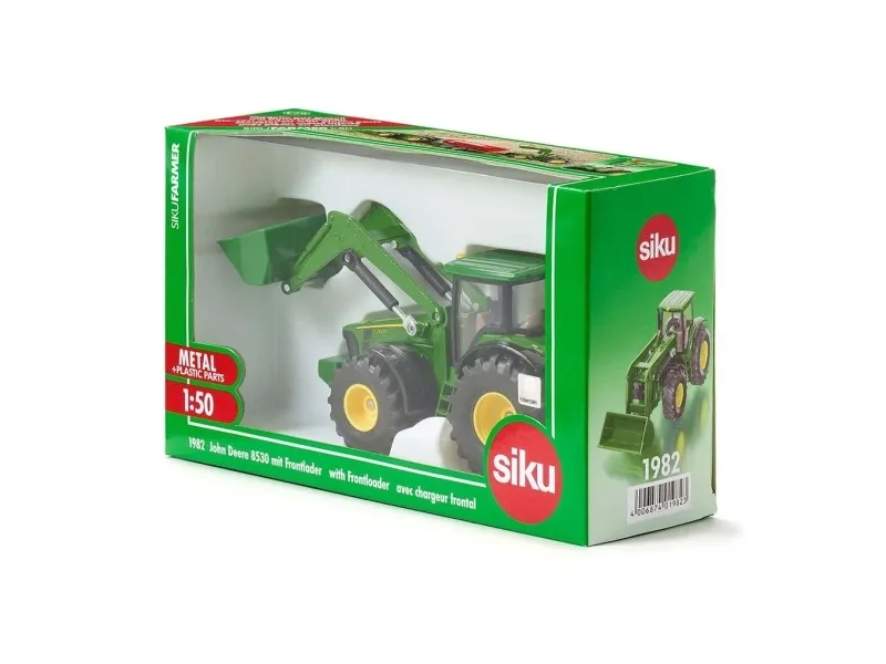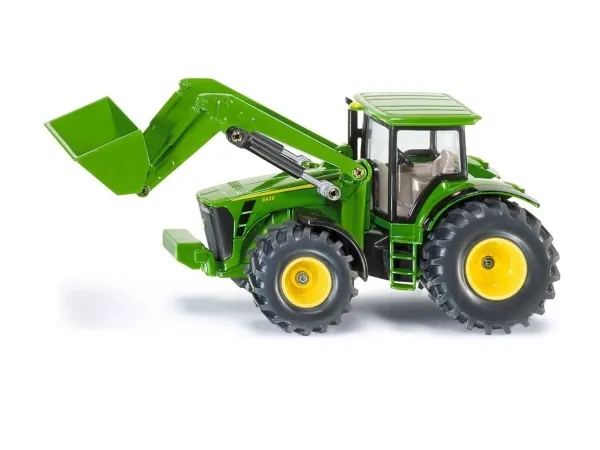 Detailed John Deere 8430 tractor with front loader. Robust and stable metal construction, Movable shovel and rocker arm, Removable roof. Incredibly durable: Mostly metal construction, Suitable for tile, parquet or carpet flooring, Excellent mobility thanks to large pneumatic rubber tyres. Excellent addition to SIKU Farmer tractors of the same scale. Scale: 1:50, Material: metal/plastic, Dimensions: 15.8 x 5.7 x 6.9 cm.