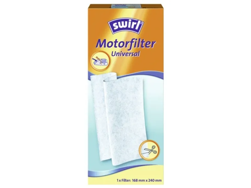 Why a Motorfilter?\n\nThe motorfilter is placed between Dust Filter Bag and motor of the vacuum cleaner. It protects the motor against rough dirt (such as stones) and hard particles (e.g. vacuumed metal clips) etc. Hence, a torn Dust Filter Bag cannot cause damage to the motor.\n\nRecommendation: filter should be changed once a year.\n\nMotorfilter Universal 01\n\nSimply place the used lter on the Swirl® Motorfilter Universa mark the contours and cut it out accordingly.\nFollow the manufactor's instructions.