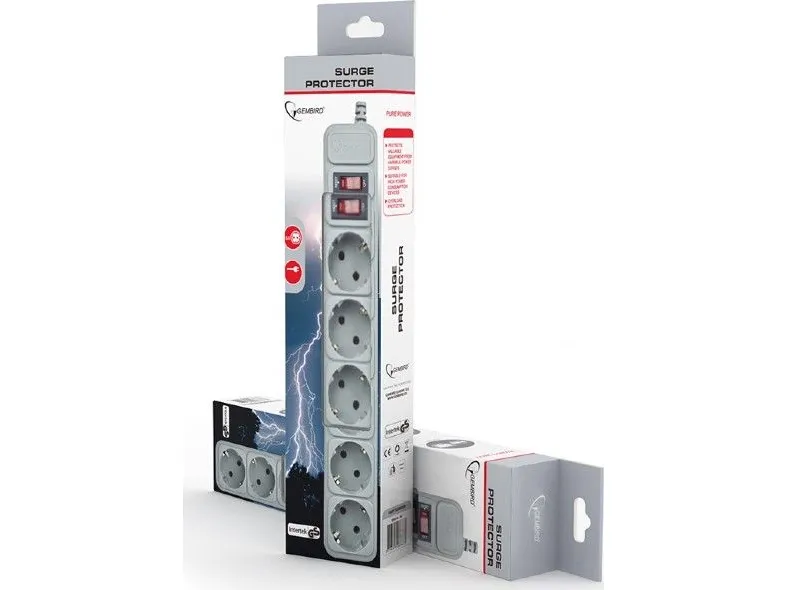 GS approved surge protector with German type AC sockets Power surge and over-voltage suppression: protects computers, other office equipment and home appliances from harmful power surges and spikes 16 A automatic circuit breaker High quality, flame retardant plastic case Mounting holes VDE-approved power cord with German plug Power rocker switch with indicator lightGembird SPG6-B-10C. Cable length: 3 m. AC outlets quantity: 6 AC outlet(s). AC input voltage: 250 V, Maximum current: 16 A. Weight: 479 g. Package width: 45 mm, Package depth: 98 mm, Package height: 390 mm