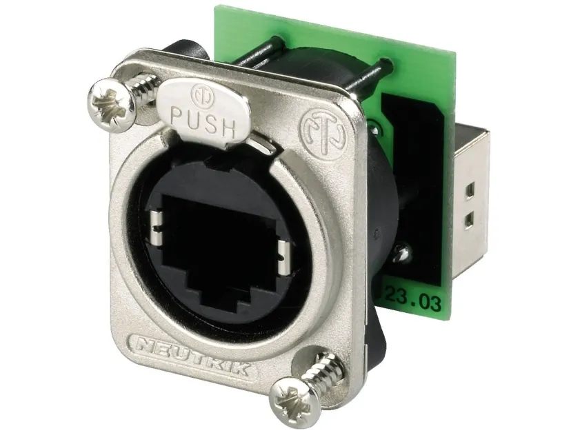 RJ45 feedthrough receptacle, D-shape metal flange with the latch lock. Mounting screws included.