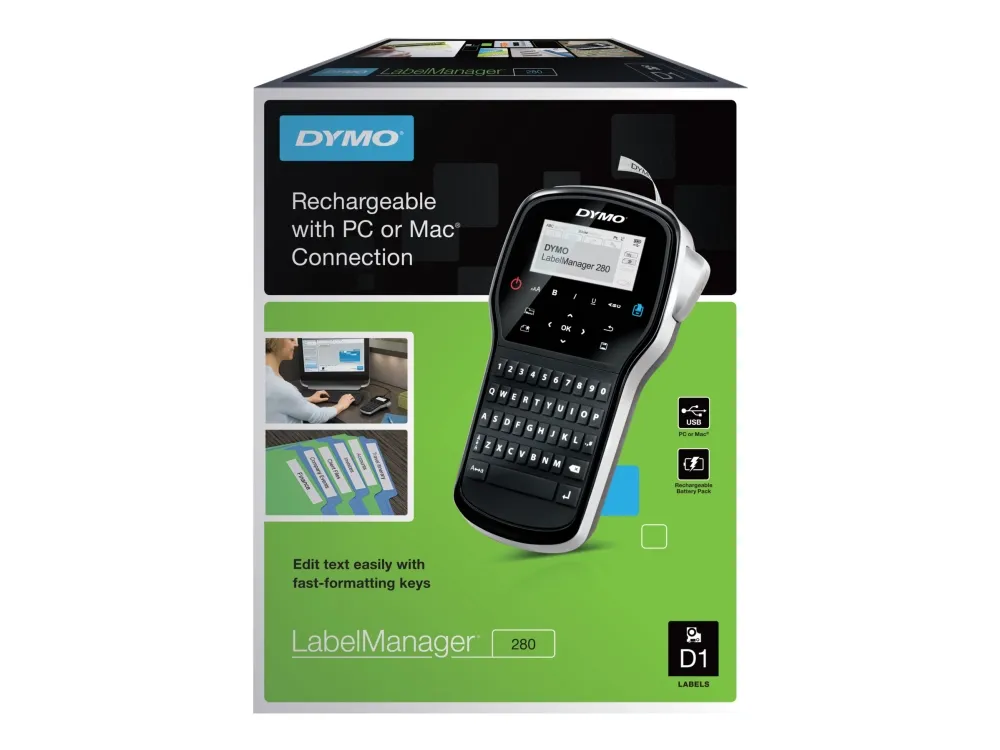 Kannettavalla ja ladattavalla DYMO LabelManager 280 -tarralaitteella saat asiat järjestykseen. Kytke laite PC- tai Mac-tietokoneeseen, niin saat yksilöllisiä tarroja lisäämällä fontteja ja grafiikkaa. Tietokonetyylisellä, asetteluiltaan maakohtaisella näppäimistöllä tekstin kirjoittaminen on nopeaa ja helppoa. Muokkaa tekstiä nopeasti yhden kosketuksen pikanäppäimillä. Lataa, kirjoita ja tulosta - ladattava akku säästää kustannuksia ja vähentää paristojätettä. LabelManager 280 tulostaa 50 % nopeammin kuin muut DYMO-tarratulostimet.
