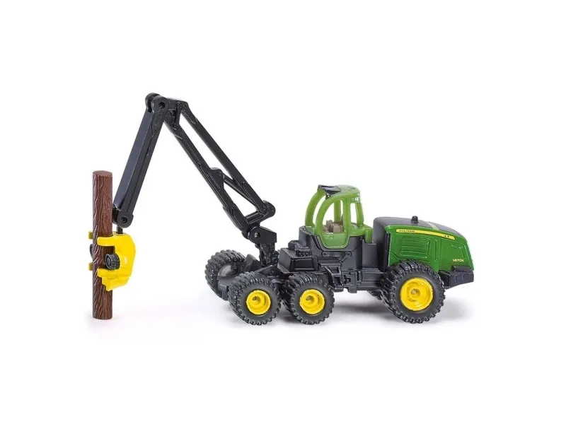 Detailed toy model of a John Deere harvester. Robust and stable metal frame, Excellent mobility thanks to rubber tyres. Rotating and swivelling crane. Incl. 1 log and Grab for transporting logs. Perfect addition to other siku products. Material: metal/plastic, Scale: 1:87, Dimensions: 13.2 x 3.5 x 8.2 cm.