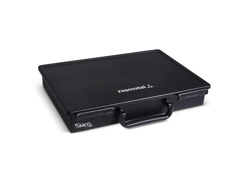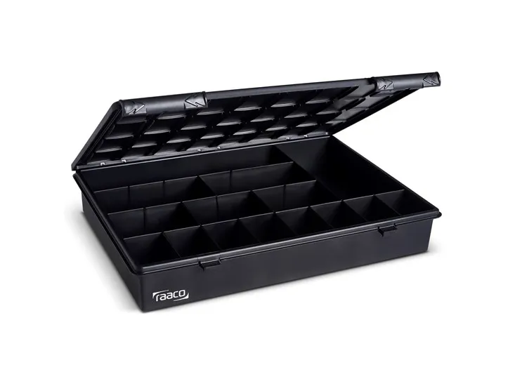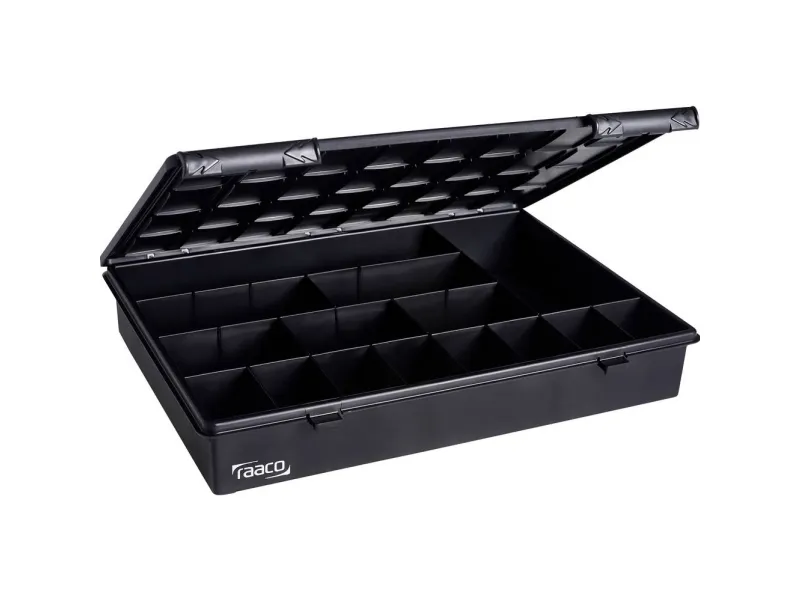 Lajittelulaatikko ESD Assorter Materiaalitiedot 4-15ESD Lajittelulaatikko, jossa on 15 kiinteää avainpaikkaa erikokoisina, sis. liukusulkimet. Kannessa olevat varmistusprofiilit eivät liu'u sisällöstä.