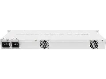 The device comes in a 1U rackmount case with two 100-240 V power supplies with failover functionality. A RJ45 console port is available for management and debugging, and a mode button can be customised to execute any RouterOS commands.