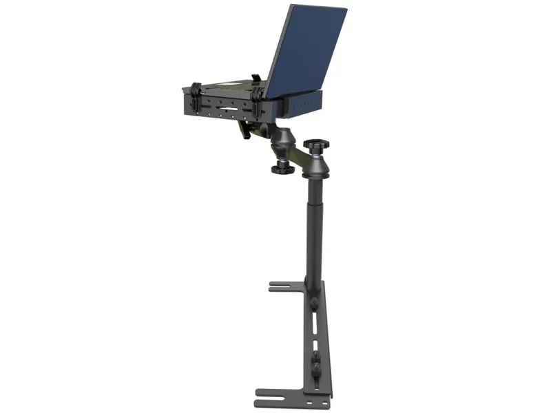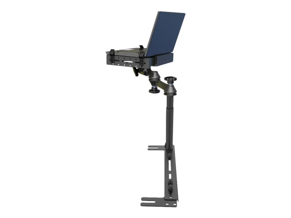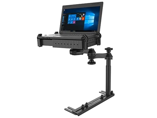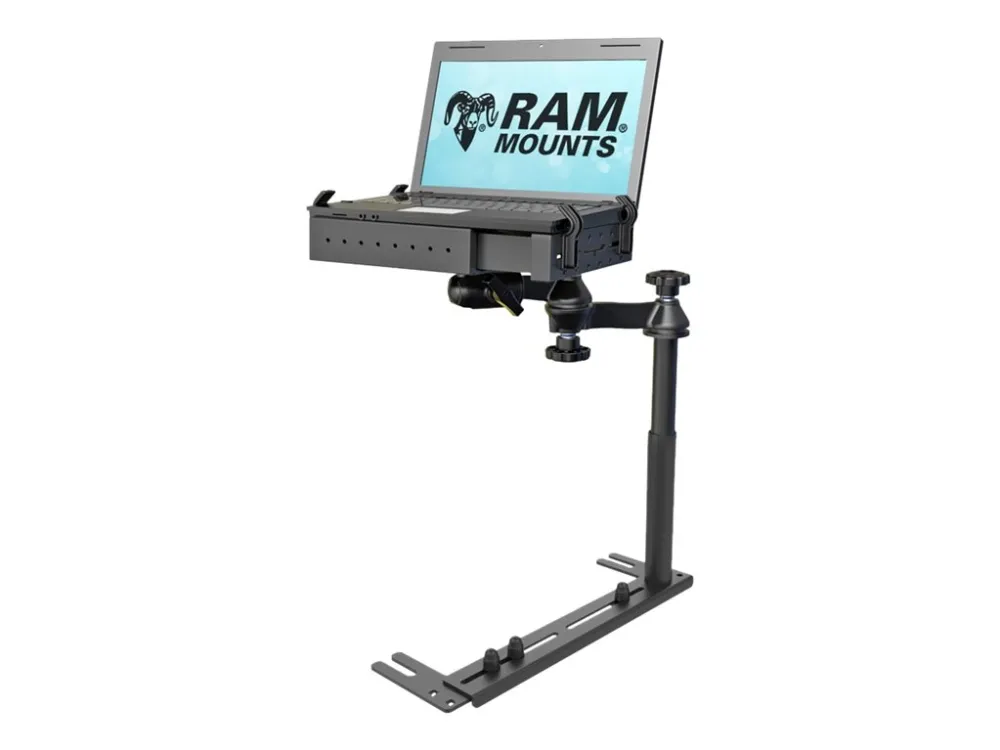 The RAM Universal No-Drill Laptop features a heavy-duty steel mounting base designed to fit a variety of vehicles. Using the front bench or passenger side seat rail bolts as attachment points, existing hardware is used to secure the laptop mount base in the vehicle.