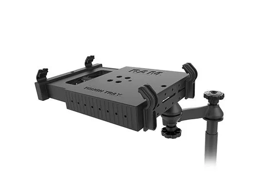 The included RAM Tough-Tray is spring loaded to accommodate 10" to 17" laptops. The tray features four adjustable retaining arms with rubber grips. These arms can be moved both vertically and horizontally, enabling a custom fit for varying thicknesses of laptops and access to ports or drives. A screen support and USB light are also available to accessorize the tray. Hole patterns on perimeter of tray facilitate the mounting of additional RAM systems to support phones or other electronics.