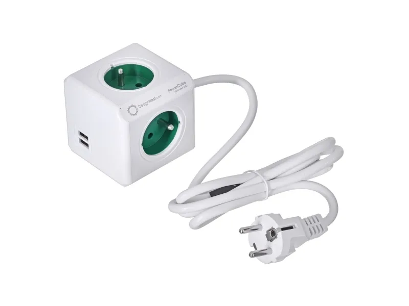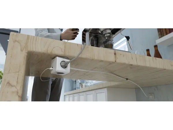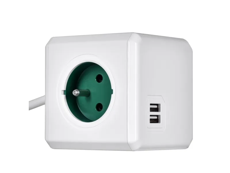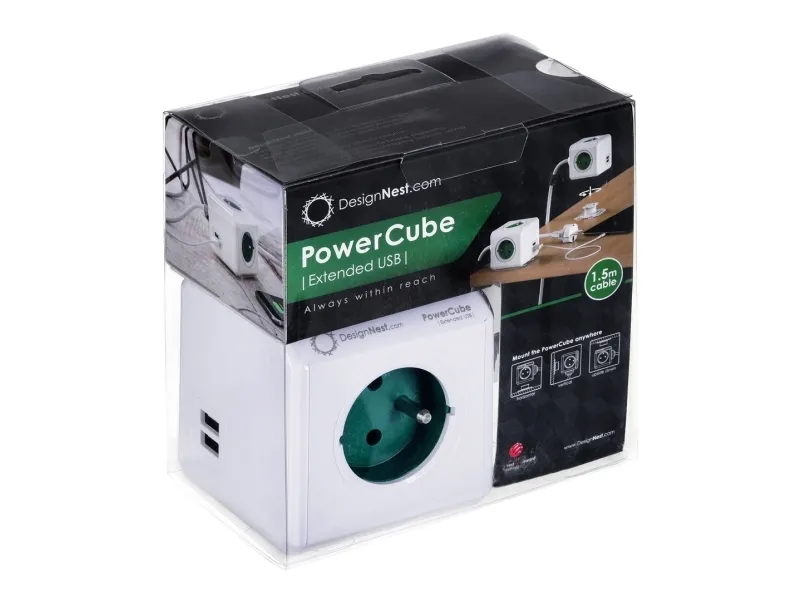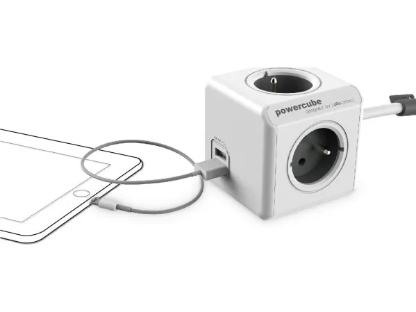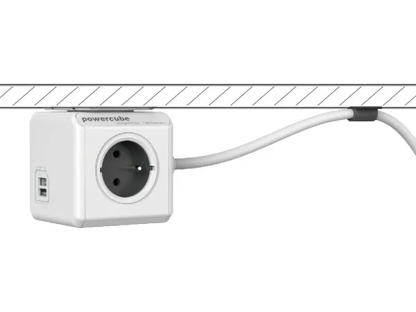 Siinä on tavallinen 1,5 metrin jatkojohto, joten se voidaan asentaa minne tahansa, jotta pistorasia on käden ulottuvilla. Tätä varten mukana on kiinnitettävä telakka. Ihanteellinen paikka on työpöytäsi: kannettavaa tietokonetta ei enää tarvitse kytkeä pöydän alle! Tässä PowerCubessa on myös USB-portti, joten mobiililaitteesi voidaan ladata työpöydältäsi.