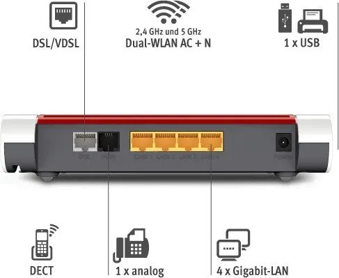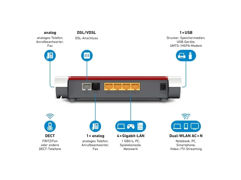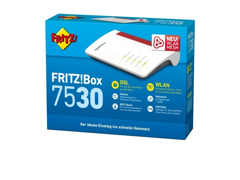 The FRITZ!Box 7530, which comes in a compact, white housing, can be used at DSL connections and is especially suitable for speedy super-vectoring connections.