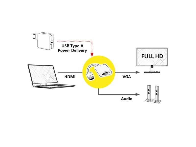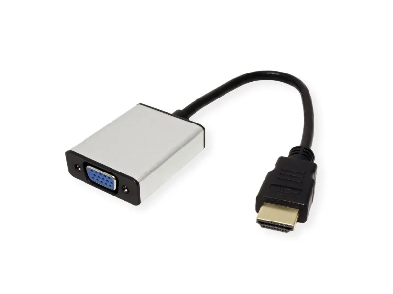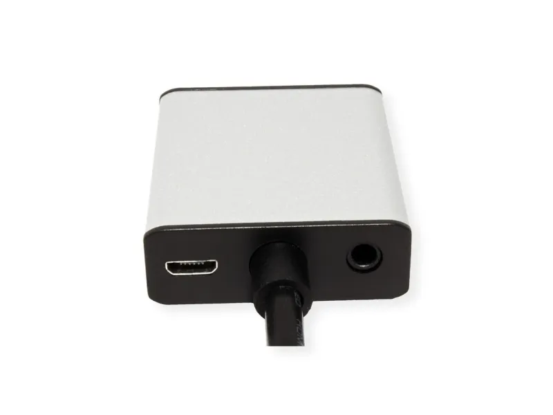 VALUE Adapterikaapeli HDMI-VGA+3,5 mm Audio (Stereo )Voit käyttää nykyaikaisia kannettavia tietokoneita, joissa on HDMI-lähtö, näytöissä, joissa on VGA-tulo! Tämä adapterikaapeli mahdollistaa kuvan ja äänen lähdön HDMI-lähteestä laitteisiin, joissa on VGA-liitäntä ja ylimääräinen audiolähtö tukee ääntä ja videota: HDMI-lähteen audiosignaali lähetetään 3,5 mm:n liittimellä audiotuloon ja USB-kaapelin kautta (A-tyypin - Micro B liitin/liitäntäpistoke) resoluutio jopa 1080p pituus: 0,15 m (HDMI) väri: hopea/musta Huomautus: Tämä adapteri toimii vain yhteen suuntaan HDMI:stä VGA:han