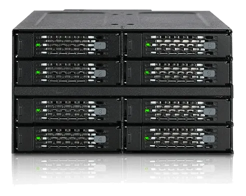 Introducing the ICY DOCK ToughArmor MB508SP-B 8-bay 2.5" drive cage for hard drives and SSDs, designed for high-density storage of 8x 2.5" SAS/SATA HDD/SSD from 5-15mm in 2x 5.25" CD/DVD optical drive bays, making it the densest drive cage available supporting full 15mm drives. Support for 15mm hard drives means enterprise SAS drives and high capacity drives are fully supported, which are used in applications requiring long-term reliable and fast data storage for archival and backup purposes. Two Mini-SAS HD connectors are used to connect all 8 drives, greatly reducing cable clutter over traditional SATA ports and improving reliability due to the interference reducing EMI shielding built into Mini-SAS HD cables. To further improve reliability and security, MB508SP-B uses a ruggedized full-metal construction meeting flammability requirements, as well as a large 80mm user-adjustable cooling fan to protect against drive failure from overheating.