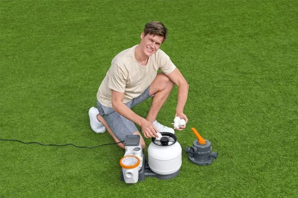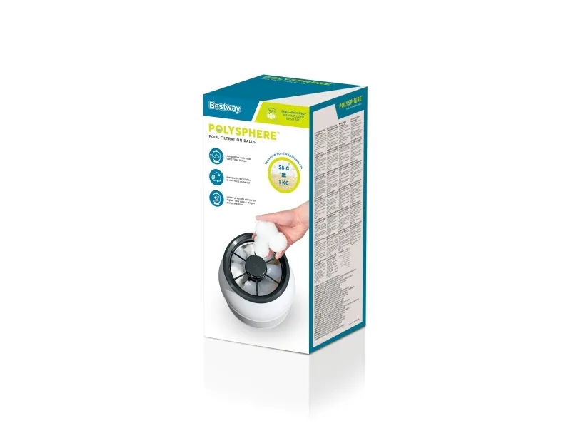 - Material: 100% PET\n- Suitable for all existing sand filters in the Bestway® range\n- Lowest pressure increase in comparison to sand\n- 500 g (1.10 lbs) of Flowclear™ Polysphere is equal to 18 kg(39.68 lbs)of sand Flowclear™ Polysphere quantity is as follow: Sand filter Weight if using sand Weight if using Flowclear™ Polysphere Bestway® 2,006L/h(530gal. /h) 8.5kg(18.74 lbs) 240g(0.53 lbs) Bestway® 3,785L/h(1,000gal. /h) 18kg(39.68 lbs) 500g(1.10 lbs) Bestway® 5,678L/h(1,500gal. /h) 25kg(55.12 lbs) 700g(1.54 lbs) Bestway® 7,571L/h(2,000gal. /h) 35kg(77.16 lbs) 1000g(2.20 lbs) Notes: Flowclear™ Polysphere can also be used for other sand filters using 28g(0.06lbs) Flowclear™ Polysphere to replace for 1kg(2.20lbs) sand\n- Easy to carry, manipulate, and transport\n- Low weight for easy handling\n- Excellent filtration result and efficiency\n- Long life product\n- Easy to wash by hand\n- Back washing function by Bestway® sand filter not applicable\n- Easy disposal, non toxic\n- Full color box\n- 1 Sets., 10.6kg (23.5lbs)\n- Contents: 500g(1.10 lbs)Flowclear™ Polysphere
