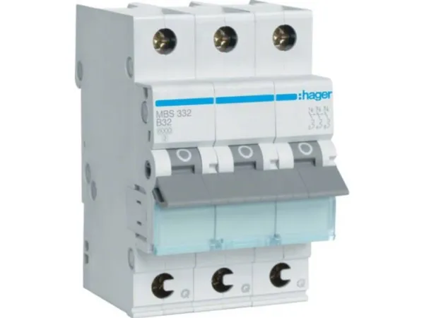 Hager MBS332. Rated current: 32 A, AC input frequency: 50 - 60 Hz. Type: Type B, Modules quantity (max): 3 module(s). Width: 52.5 mm, Depth: 70 mm, Height: 83.4 mm