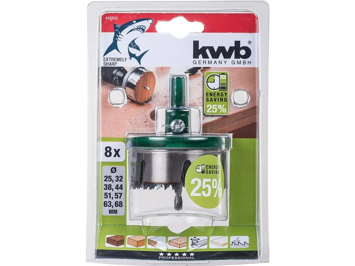 Hole saw, 8 pcs., heavy zinc diecasting carrier plate, saw rims made of hardened spring steel, tooth tips with inductive hardening, for use in wood, plastic-coated wood, hard wood, chipboard, gypsum plasterboard, lightweight building boards, plastic and copper.kwb 498920. Type: Set, Suitable for: Drill, Suitable for materials: Copper, Hardwood, Laminated panel, Non-ferrous metal, Plasterboard, Plastic, Softwood, Wood. Package type: Blister. Number of hole saws: 8 pc(s)