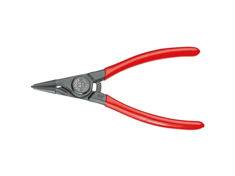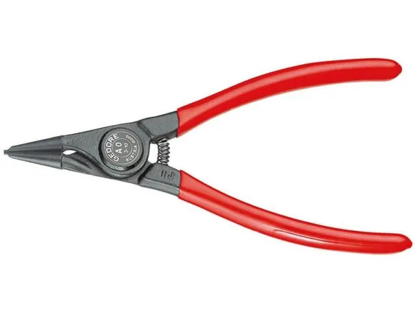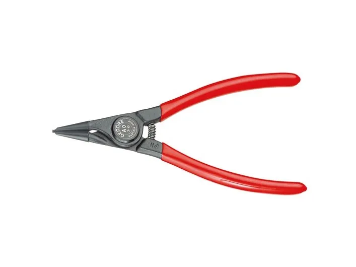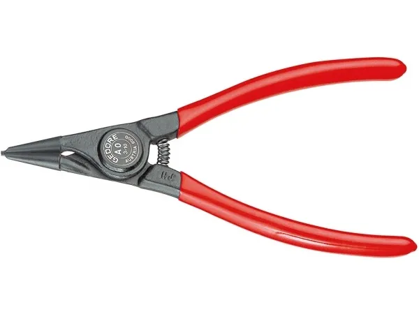 For retaining rings as per DIN 471, DIN 983. DIN 5254 Form A. Straight tips. With opening spring . With clamping protection. Forged Gedore chrome-vanadium special hardened and tempered steel. Precision machined, oil hardened and annealed. Black, with red dipped handles.