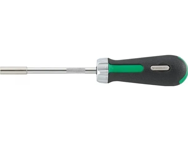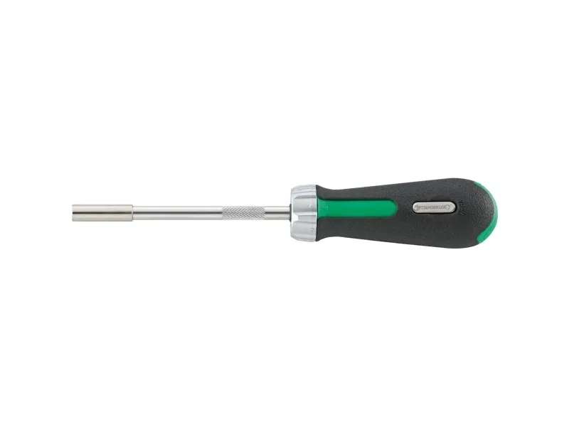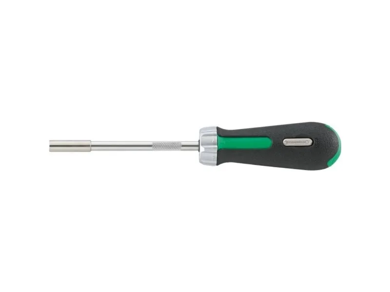 · enkel retningsskift (venstre, højre og fastgjort) ved kort drejning af omskiftningen · ergonomisk formet, skridsikker 2-komponentgreb til optimal kraftoverførsel · opbevaringsrum i enden af grebet til 6 bits - åbner ved et tryk på en knap (Gr. 1) · til bit-skruetrækkerindsatser med udvendig sekskant 1/4 din 3126/ISO 1173 form C 6,3 · 1/4 topnøgleindsatser kan anvendes med forbindelsesdel nr. 3115/1 (udvendig sekskant og udvendig firkant 1/4) · enkel bit-skift med indvendig sekskant med magnet · riflet hurtigløbszone til hurtig vridning af skruer · mekanisme til høj belastning med 48 tænder (7,5° arbejdsvinkel)