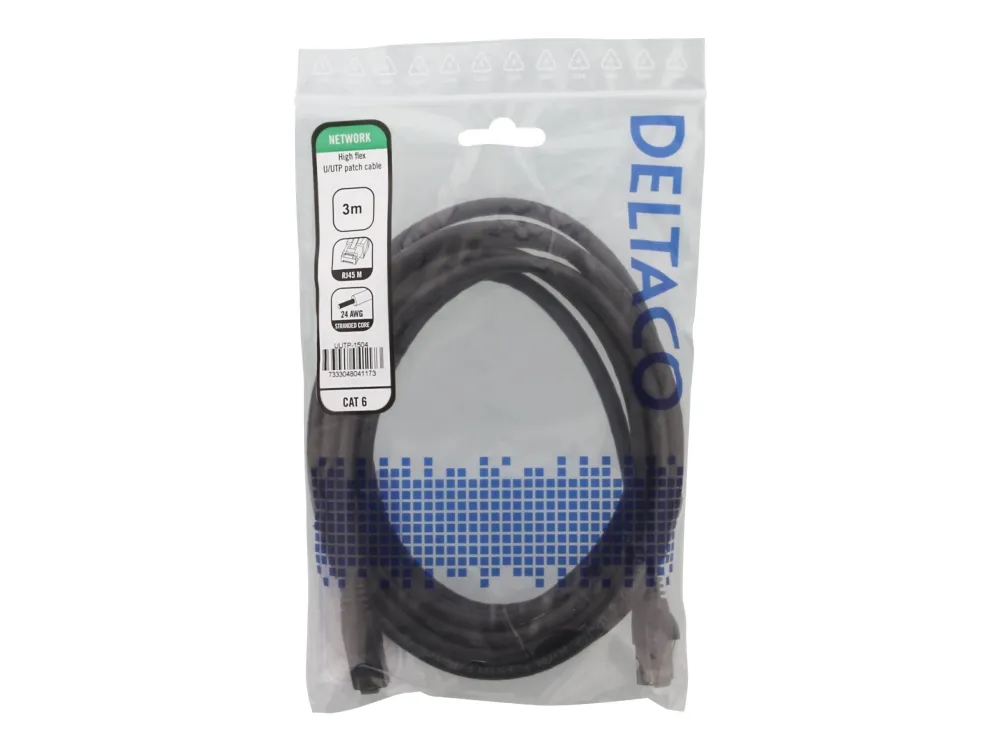 DELTACO U/UTP High Flex Cat6 patch cable, 3m, stranded core, 24AWG, 500MHz, LSZH, black