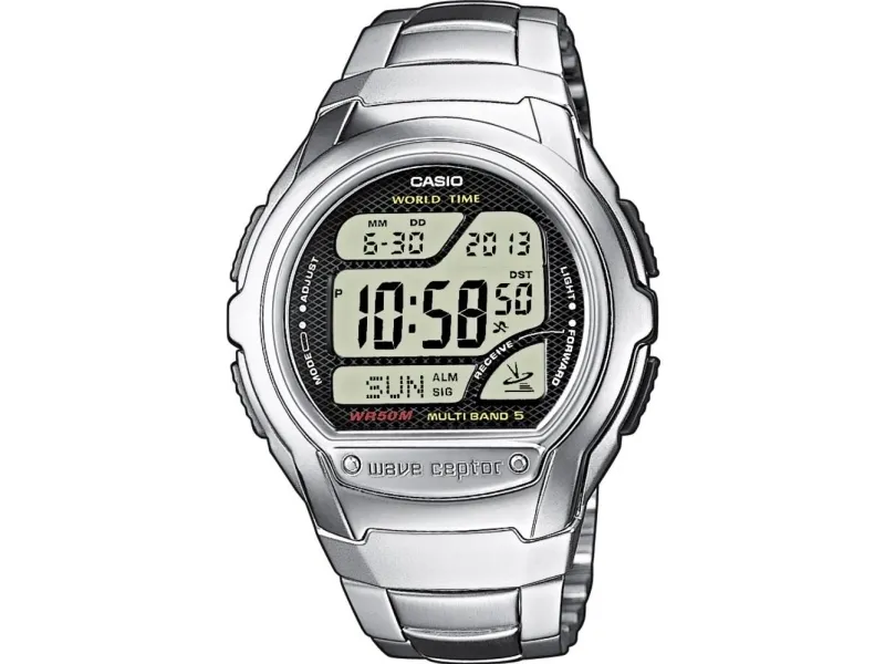 Illuminator \nAn electro-luminescent panel causes the entire face to glow for easy reading. Includes an After-Glow feature that keeps the EL backlight turned on for a few seconds after the light button is released.\n\nDCF/MSF/WWVB/JJY radio signal receiver \nIn Europe or North America, in many parts of Canada and Central America or Japan - once the watch has been set to the local time zone, it receives the relevant signal ensuring that it always shows the exact time. In many countries the summer and winter time is also shown automatically.\n\nWorld time function \nDisplays the current time in major cities and specific areas around the world.\n\nStopwatch function - 1/100 sec. - 1 hour \nElapsed time, split time and final time are measured with 1/100-sec accuracy. The watch can measure times of up to 1 hour.\n\nTimer - 1/1 min. - 1 hour \nFor fans of precision: the countdown timers help you to remember specific or recurring events by giving off an audible signal at a preset time. The time can be set to the nearest minute and up to 1 hour in advance. Ideal for people who need to take medicines every day or those who do interval training.\n\nDaily alarm \nThe daily alarm reminds you of events that recur every day, by emitting an audible signal at the set time. In addition, an adjustable alarm alerts you when every full hour has elapsed.\n\nMulti-language \nThe name of the day can be displayed in different languages.\n\nAutomatic calendar \nOnce set, the automatic calendar always displays the correct date.\n\n12/24-hour timekeeping \nTimes can be displayed in either a 12-hour or 24-hour format.\n\nSpherical glass \nThe surface of the watch glass is domed. This offers a high level of stability and resistance against pressure.\n\nResin case \n\nStainless steel band \nTough, durable and elegant: The stainless steel wrist strap gives your watch that classic feel.\n\nSafety Catch \nAlways reliable: This watch has a particularly secure safety catch, which helps prevent the strap from opening by mistake. \n\n2 Years - 1 Battery \nThe battery supplies the watch with sufficient energy for approx. two years.\n\nWater resistance classification (5 bar) \nThis watch can be worn when showering and bathing - it is tested for water resistance up to 5 bar / 50 metres. The metres value does not relate to a diving depth but to the air pressure used in the course of the water resistance test. (ISO 2281)
