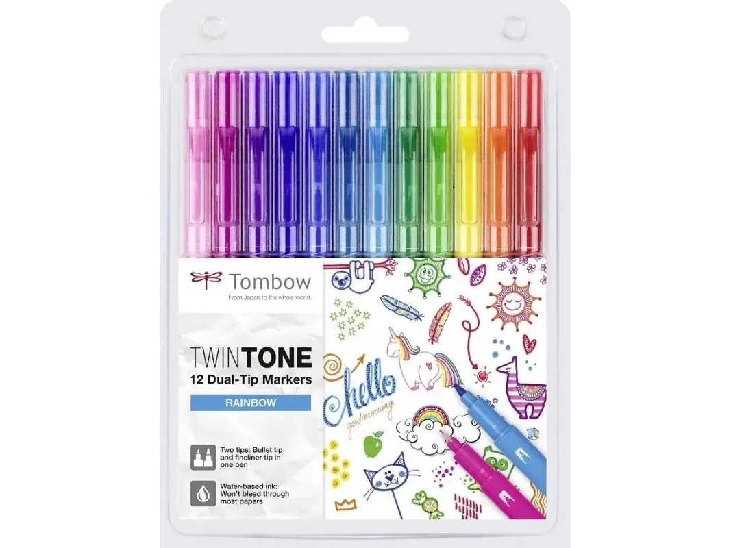 Tombow-merkkikynät kahdella kärjen leveydellä ohuille tai paksummille viivoille. Pyöreä kärki, jossa on 0,8 mm:n viivanleveys ja hienoviivakärki, jossa on 0,3 mm:n viivanleveys. Vesipohjainen muste, joka ei tunkeudu papereihin. Täydellinen kirjoittamiseen, luonnostelemiseen, doodlaamiseen, piirtämiseen ja moneen muuhun tarkoitukseen. 12 kappaletta setti sateenkaaren väreissä (1 x kutakin: 03 keltainen, 06 keltainen/vihreä, 07 vihreä, 13 vaaleansininen, 17 sininen, 17 sininen, 19 purppurainen, 25 punainen, 28 oranssi, 45 tummansininen, 58 vaaleanpunainen, 80 vaaleanpunainen, 84 turkoosi).