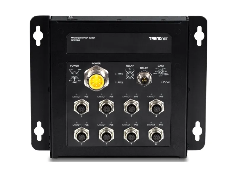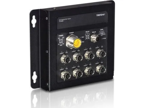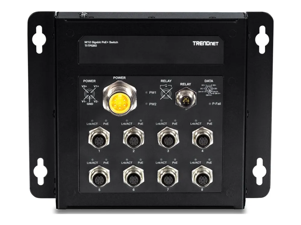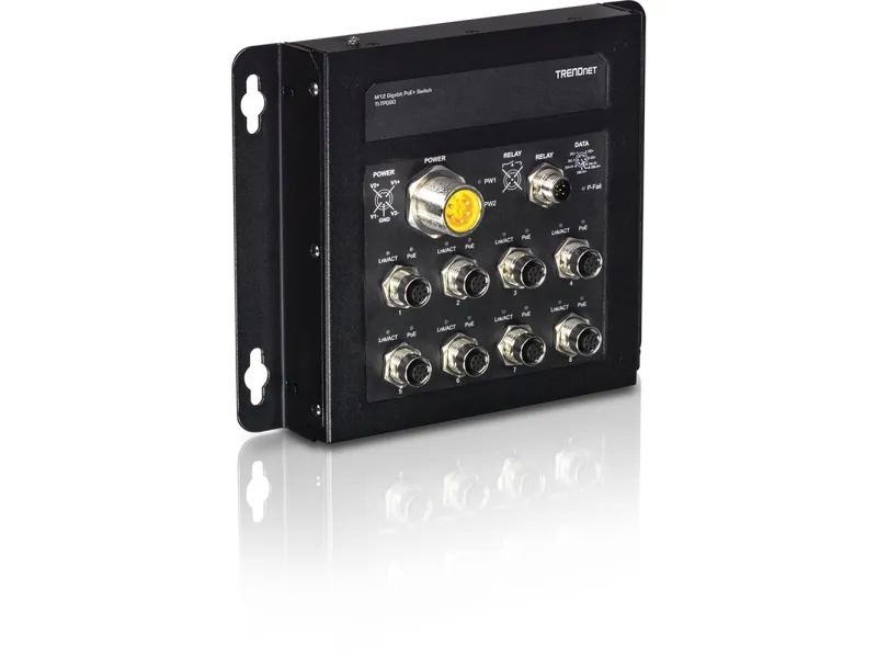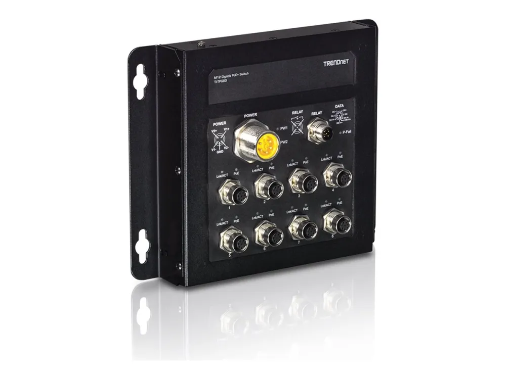 TRENDnet's 8-Port Industrial EN50155 M12 Gigabit PoE+ Railway Switch, model TI-TPG80, has eight M12 gigabit PoE+ ports with a total PoE budget of up to 200 W. This M12 railway switch is equipped with an IP40 rated metal enclosure, designed to withstand a high degree of vibration and shock, while operating within a wide temperature range of -40° - 75°C (-40° - 167°F) for industrial EN50155 applications. This industrial M12 switch supports an input voltage range from 24 - 56 V DC with M23 power interface and M12 alarm relay interfaces for moving bus, train, and other rolling stock applications. Designed and tested for transportation and telco applications.