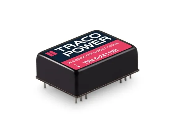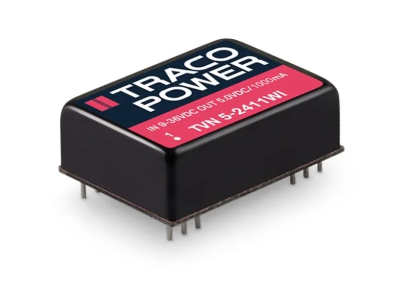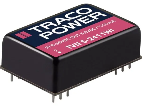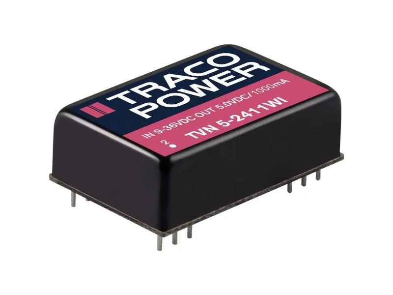DC/DC-muunnin, TVN 5 wifi-sarjaErittäin matala ripple-jännite 10 mVp-p-tyyppi. Kuusisivuinen suojattu DIL-24 metallikotelo, tulosuodatin EN 55022:n mukaan, luokka B, 4:1 tuloalue, I/O-eristys 1500 V/DC.