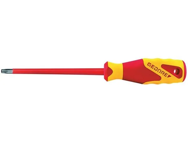 Individually tested, VDE insulation up to 1000 V, acc. to EN 60900/IEC 60900, fully insulated blade. 3-component handles Power-Grip3 with hanging hole. Ergonomic handle design enables precise and fatigue-free working. Positive-fit joint of handle and blade for optimum transmission of force. Type of drive marked at end of the handle. Blade from Gedore molybdenum-vanadium-Plus tempered steel. TORX® = reg. trademark of Acument Intellectual Properties, LLC. USA.