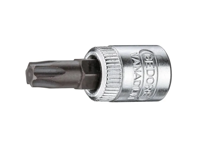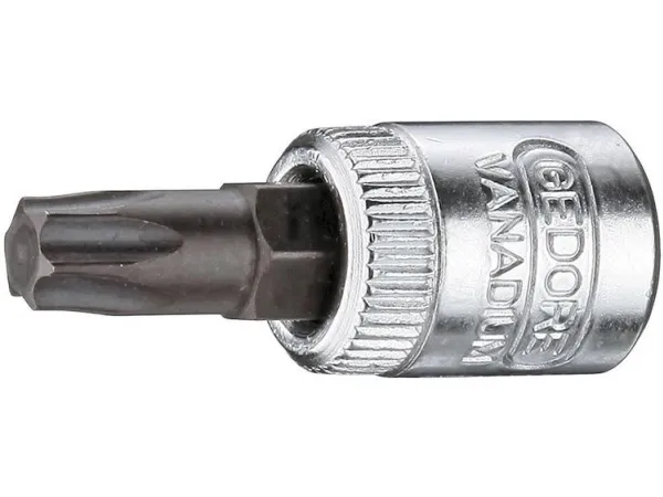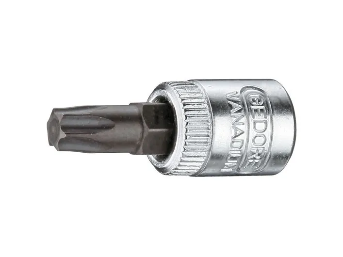Square drive as per DIN 3120 - C 6.3, ISO 1174, with ball retaining groove. Hand-operated, knurled grip. Chrome-plated. With pressed-in pin in Gedore vanadium special steel, gun-metal finish. TORX® = reg. trademark of Acument Intellectual Properties, LLC. USA.