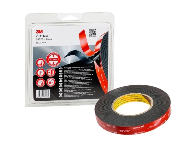 Tape 5952F sort 19mmx11m 1 .1mmVHB™ lim · Indvendigt og udvendigt · Sort · Til forbindelse pulver lakerede overflader · Til lavenergetiske materialerIdeelt egnet til mange lavenergetiske overflader, pulver lakerede overflader, plast og glas. 3M VHB™™ højtydende tape er dobbeltsidet tape af geschlossenzelligem klæbestoffet. De giver meget høj tilpasningsevne, der stilles til selvklæbende overflader. Glat eller ru overflader kan tapes over hele fladen uden spændinger. Ideelt egnet til mange lavenergetiske overflader, pulver lakerede overflader, plast (ingen blød pvc) eller glas. I mange programmer kan skyldes brugen af primern behøves ikke.