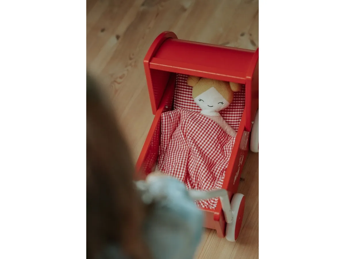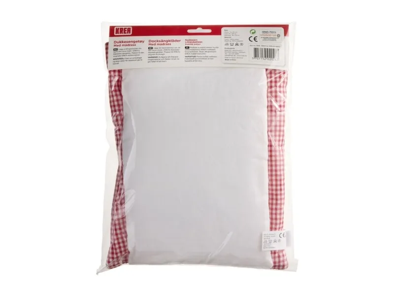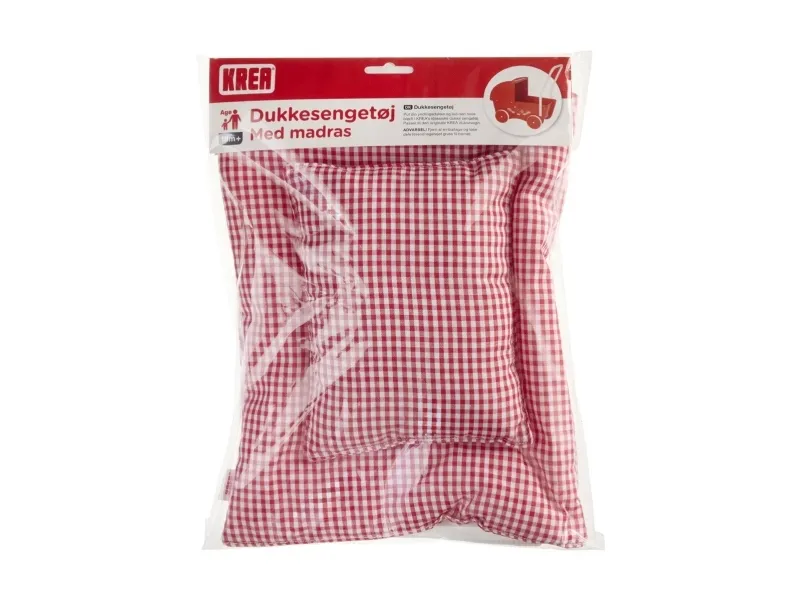 Tästä saat suloisimmat punaiset nuken vuodevaatteet 100 % puuvillaa, jotka sopivat KREA:n klassisiin punaisiin nukenvaunuihin. Vuodevaatteiden lisäksi saat myös kivan valkoisen patjan, joka sopii nukenvaunun pohjaan. Mitat: tyyny: 15 x 20 cm. pussilakana: 25 x 30 cm. patja: 18 x 32 cm,