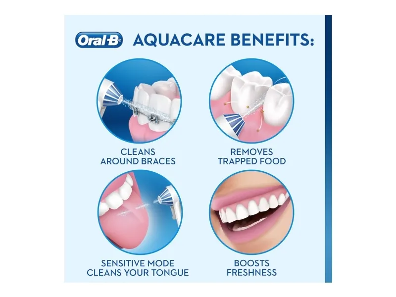 Braces and implants trap food. Oral-B’s Aqua Care carefully cleans these problem areas.