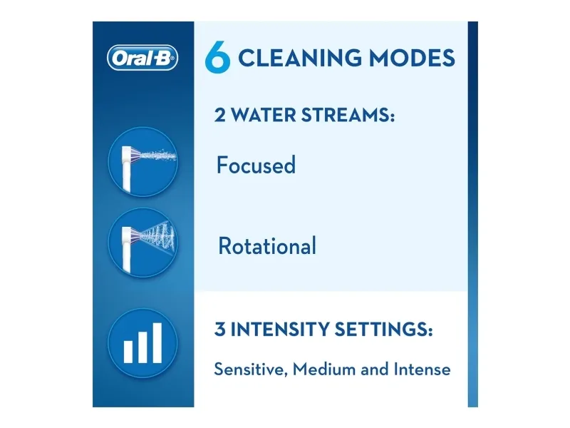 - 2 streams: choose a focused or rotational water stream for gentle interdental clean