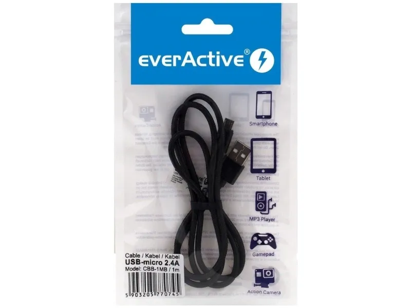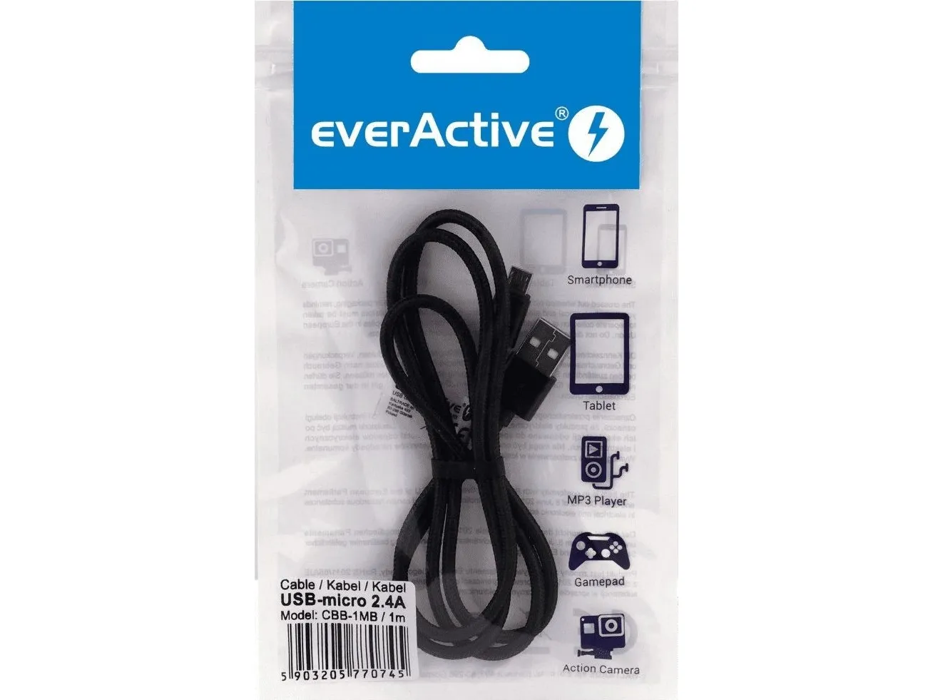 everActive Micro USB-kaapeli 1m - Musta, punottu, pikalataustuki, 2,4A - CBB-1MB - CBB-1MB