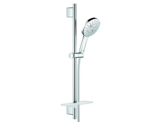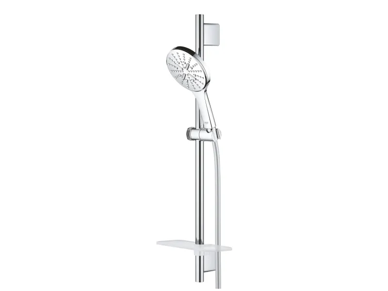 The GROHE Rainshower 130 SmartActive shower rail set – fusing cutting edge technology and minimalist design! Why not give your shower an instant upgrade with the sleek and stylish GROHE Rainshower 130 SmartActive hand shower, which delivers modern design and performance. Made in Germany, it comes with a TwistFree Silverflex shower hose (1750mm), matching rail (600mm) and a GROHE EasyReach tray to organize your shower space. It is also packed with innovative technology. GROHE SmartTip – an ergonomic controller on the rear of the handle – gives you fingertip control of the spray pattern: pulsating GROHE ActiveMassage spray, which delivers a whole new level of revitalising massage power, invigorating Jet Spray and Rain Spray – as gentle as warm summer rain. When you turn the water off GROHE DripStop minimizes annoying drips from Rain and Jet spray. Thanks to GROHE DreamSpray, the flow from every nozzle has a perfectly balanced flow for maximum satisfaction, and the silicone anti-lime SpeedClean nozzles are extra easy to clean too. It also has GROHE EcoJoy, which limits water flow to 9.5 l/min but also delivers pure indulgence, and with a durable GROHE StarLight chrome finish it looks pristine for years. The Inner WaterGuide prevents the surface from getting too hot, protecting both your skin, and the sparkling chrome. Installation is incredibly easy too – the GROHE QuickFix Plus system ensures you can use existing holes while GROHE TileFix gives you the flexibility to alter the depth of each bracket to create a perfect fit, ideal for partially tiled bathrooms. GROHE Rainshower 130 SmartActive shower rail set – where sleek modern design meets luxurious performance!