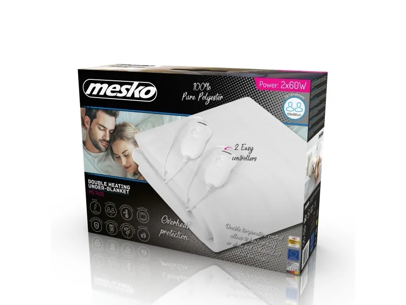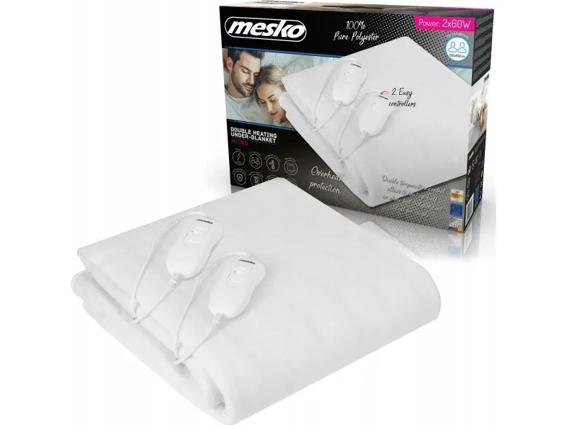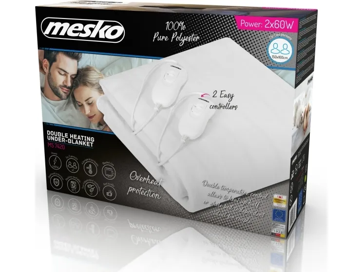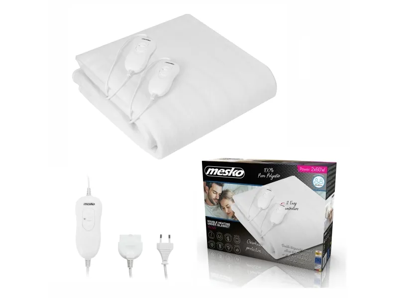 The electric blanket Mesko provides you with relaxing warmth and comfort. It is recommended for people who care for their health. The electric blanket soothes neuralgias, helps to relax your muscles and improves blood circulation. Recommended while treating arthritis and rheumatism symptoms It provides you with quick and even heat distribution. This allows you to rest with delight in a warm bed in just few minutes after switching on the electric blanket. The blanket is made of soft and gentle fabric. You can easily wash it after detaching a temperature controller and a power cord. The temperature controller allows you to choose the temperatures level and assure the over-heating protection.