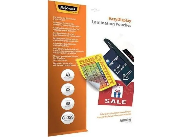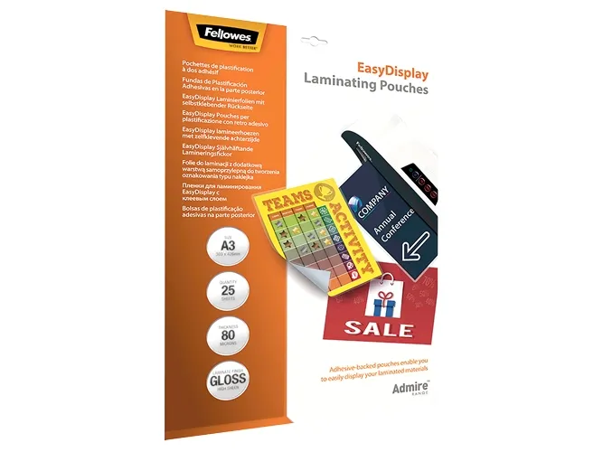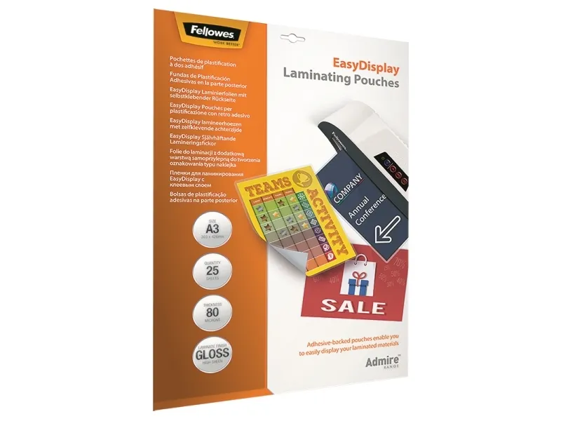 Fellowes 5601803. Material: Polyethylene terephthalate (PET), Surface finish: Glossy, Format: A3. Width: 303 mm, Depth: 0.2 mm, Height: 426 mm. Products per master (outer) case: 5 pc(s). Package width: 325 mm, Package depth: 6 mm, Package height: 475 mm