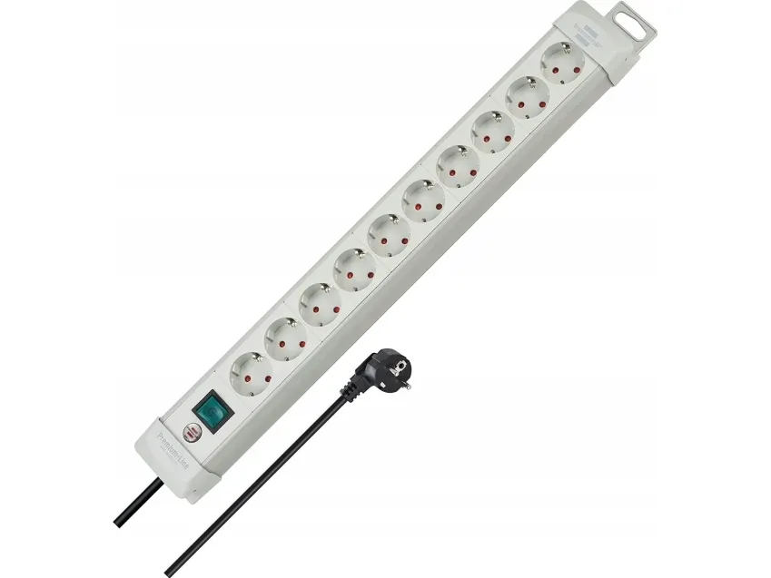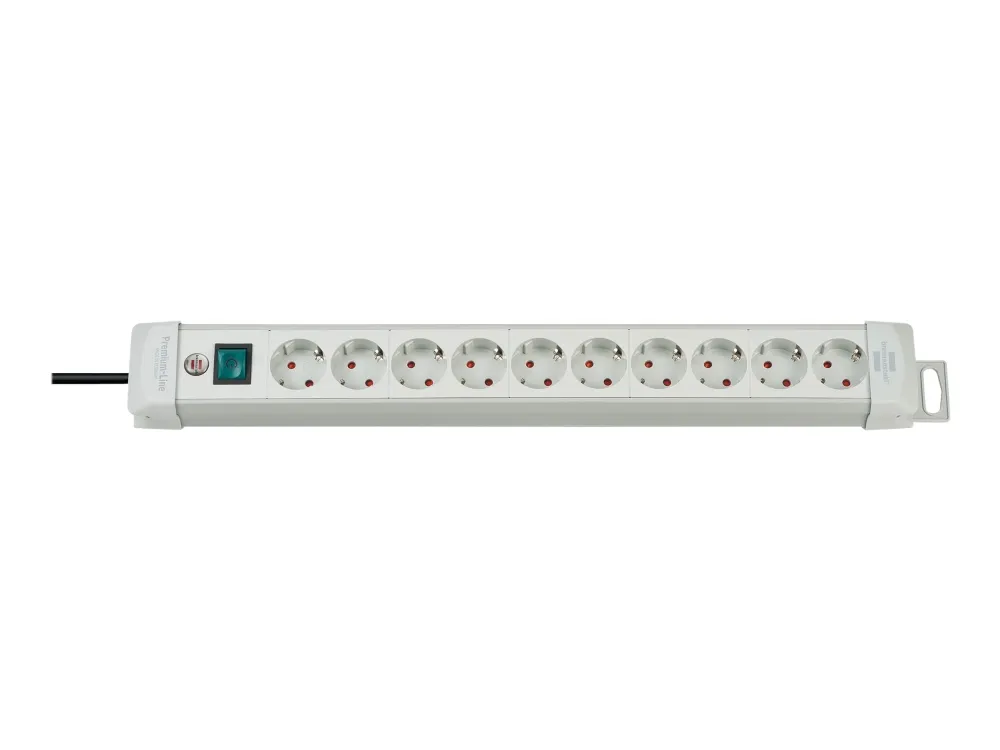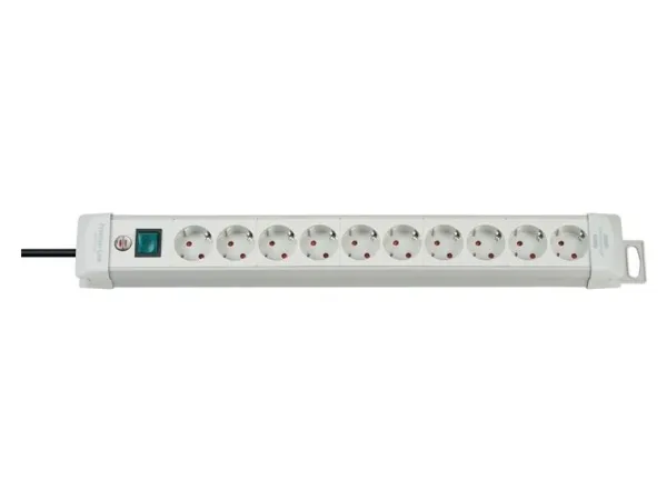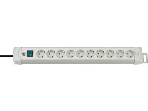 - Robust extension sockets, designed to be the best and made of break-resistant special plastic material.\n- Elegant, sleek, timeless, high-quality design.\n- Earthed sockets in a 45° arrangement, for angled plugs as well.\n- Illuminated 2-pole ON/OFF safety switch.\n- With option to wind the cable around the rail for storage.\n- With practical hanging facility.\n- Innovative mounting concept.\n- With childproof sockets.\n- Packaging: with banderole.\n- Cable length: 3 m\n- Cable: H05VV-F 3G1,5\n- Length appr.: 58 cm\n- Sockets: 10\n- Colour: Light Grey\n- Plug-in system: DE