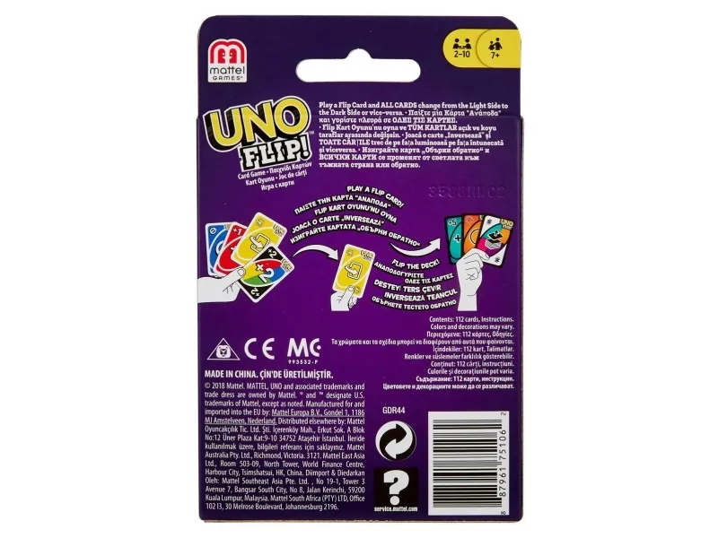 UNO Flip, from the renowned Mattel UNO product line, introduces a fresh twist to the beloved family card game. This version captivates players aged 7 and up, offering a dynamic gameplay experience that can accommodate 2-10 players. Whether for a cozy family game night or a lively party with friends, UNO Flip is designed to provide endless entertainment and laughter. The game fosters social interaction and sharpens strategic thinking, making it a valuable addition to any game collection. With its easy-to-learn rules, UNO Flip ensures that everyone, regardless of age, can join in on the fun right away. Dive into the excitement of UNO Flip and discover a new level of enjoyment in card games.