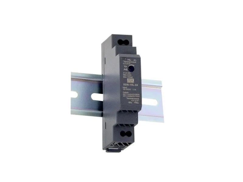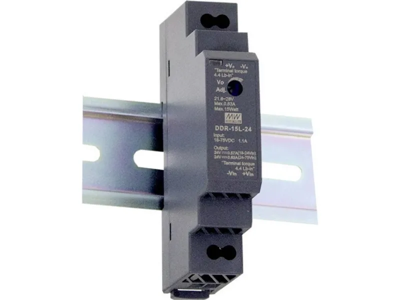 DC-DC Ultra slim Industrial DIN rail converterMEAN WELL DDR-15G-5. Width: 17.5 mm, Depth: 54.5 mm, Height: 90 mm