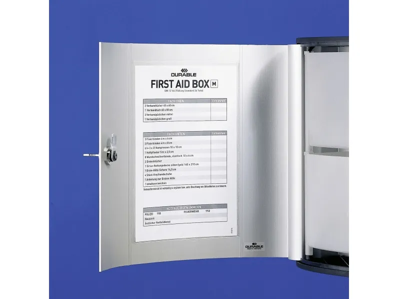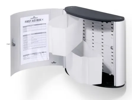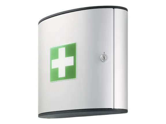 Medium sized aluminium first aid box with 2 fold-out compartments for clear and easy storage of first aid products. The lockable cabinet is supplied with 2 keys and a self adhesive first aid sign. Ideal for use by small businesses. Holds approximately 36 first aid components. Supplied empty.Dimensions: 280x302x118mm (HxWxD)