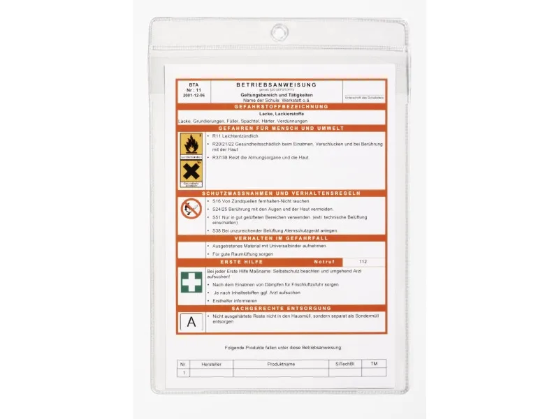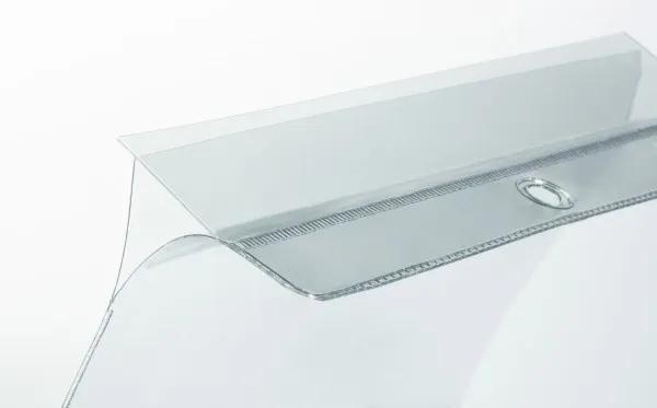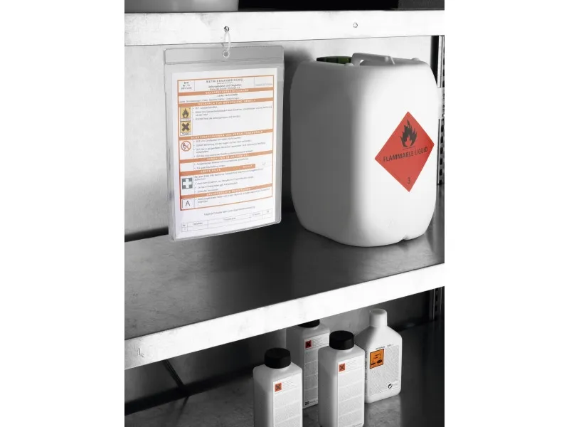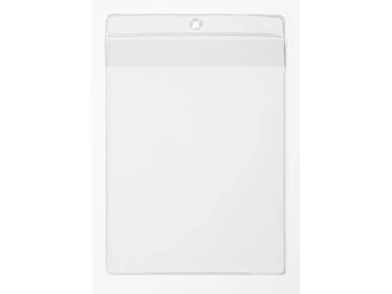 Vahvasta PP-muovista valmistettu tasku A4-kokoisten asiakirjojen ripustamiseen. Vahvistettu reikä ripustamista ja avaamista varten, yläreunassa taittuva suojaläppä.