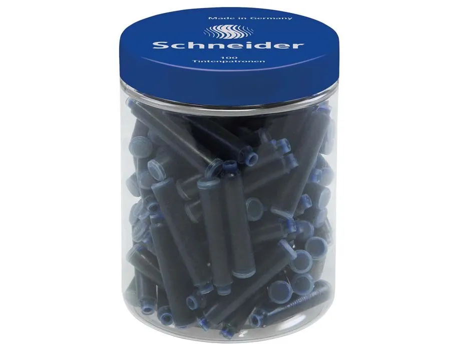 Container with 100 standard ink cartridges with ball closure. The royal blue ink is erasable. Suitable for Schneider and many other fountain pens and cartridge rollers.