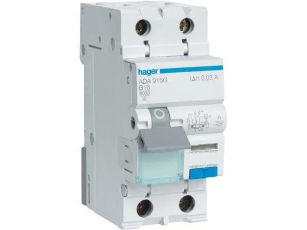 HAGER-yhdistelmäkatkaisija B 16A, 1-napainen + nollaB-ominaisuus6kA oikosulkukapasiteetti30mA laukaisuvirta, 230V AC, 36 mm leveydellä