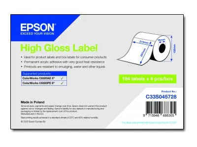 Epson High Gloss Label - Die-Cut Roll: 210mm x 297mm, 194 labels, Valkoinen, Itse kiinnittyvä tulostintarra, Stanssausmerkintä, Mustesuihku, Akryyli, Kiinteä