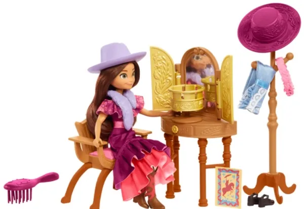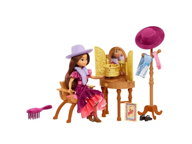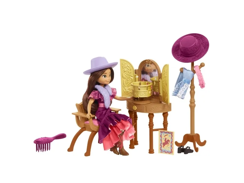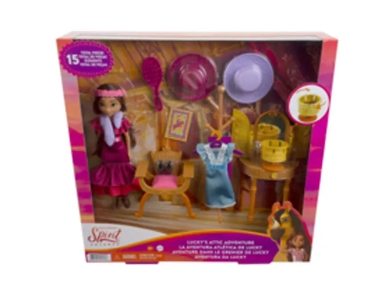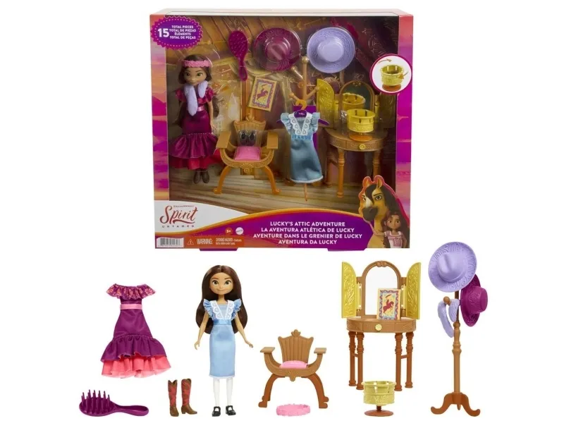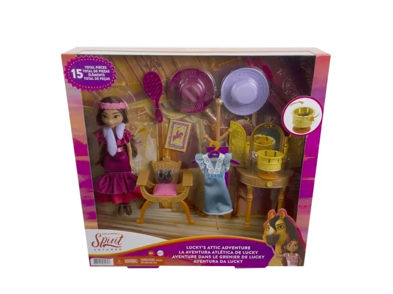 Liity mukaan DreamWorksin animaatioelokuvan, Spirit Untamed, ystävyyteen, hauskanpitoon ja seikkailuihin! Lucky's Adventurous Room Play Set -leikkisarjassa on Lucky-nukke (17 cm) kauniissa sinisessä mekossa valmiina leikkimään aarteita täynnä olevalla vintillä! Siellä on meikkipöytä, jonka ovet avautuvat ja jonka takana on peili, kuva, tuoli, mykkä, harja ja koriste-esineitä! Lucky-nukke voi kokeilla mekkoa, kahta hattua ja huivia sekä äitinsä saappaita. Leikkisarjassa on myös mini-zoe-trooppi (kuvarumpu), joka toimii kunnolla, kun sitä pyörittää! Lapset voivat kokea uudelleen hauskoja elokuvakohtauksia ja leikkiä pukeutumisleikkejä Lucky's Adventurous Room -leikkisarjassa.