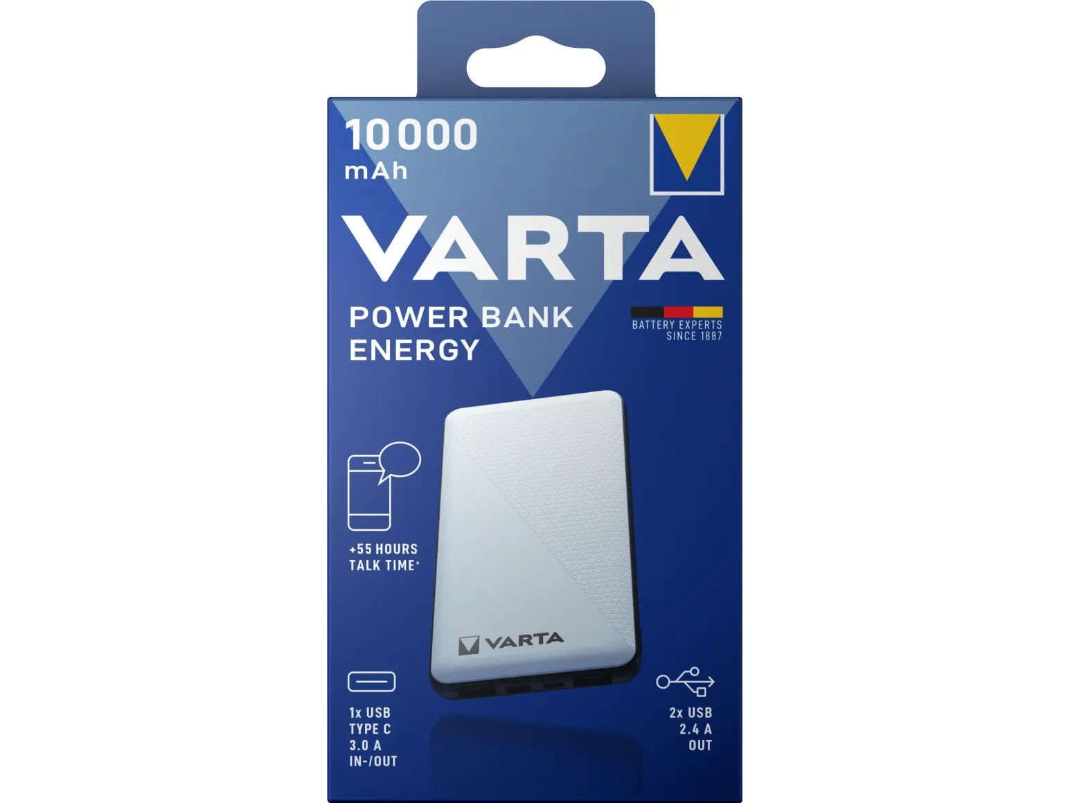 Varta Energy 10000, Musta, Valkoinen, Universaali, Litium polymeeri (LiPo), 10000 mAh, USB, 3,7 V