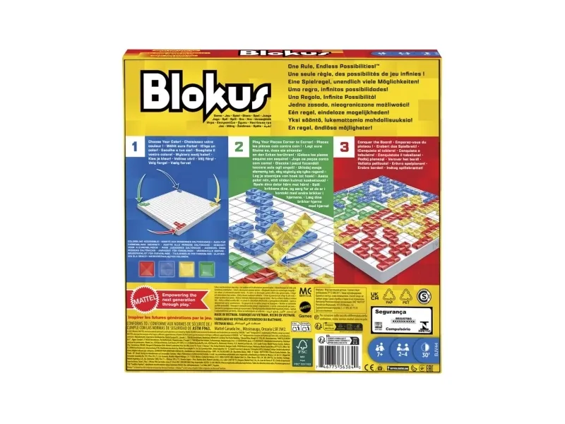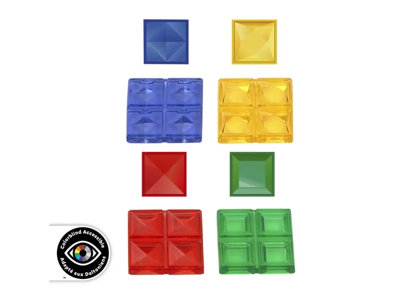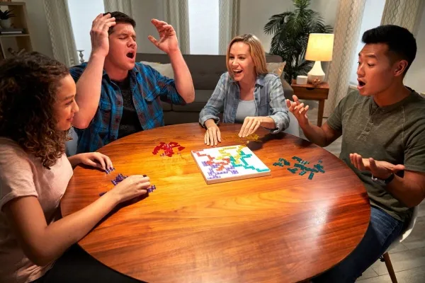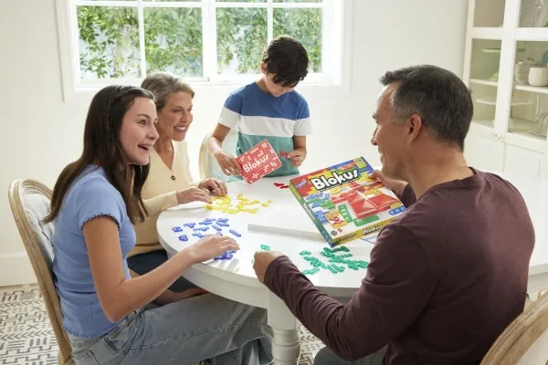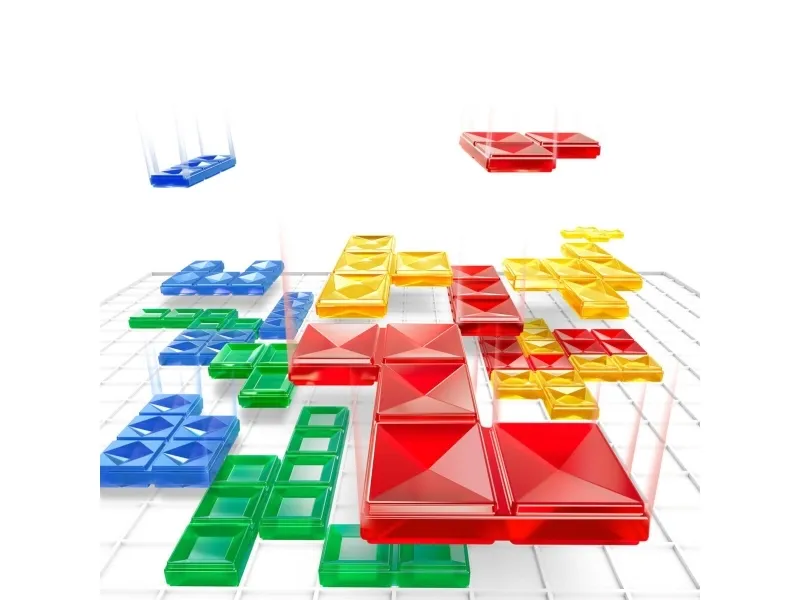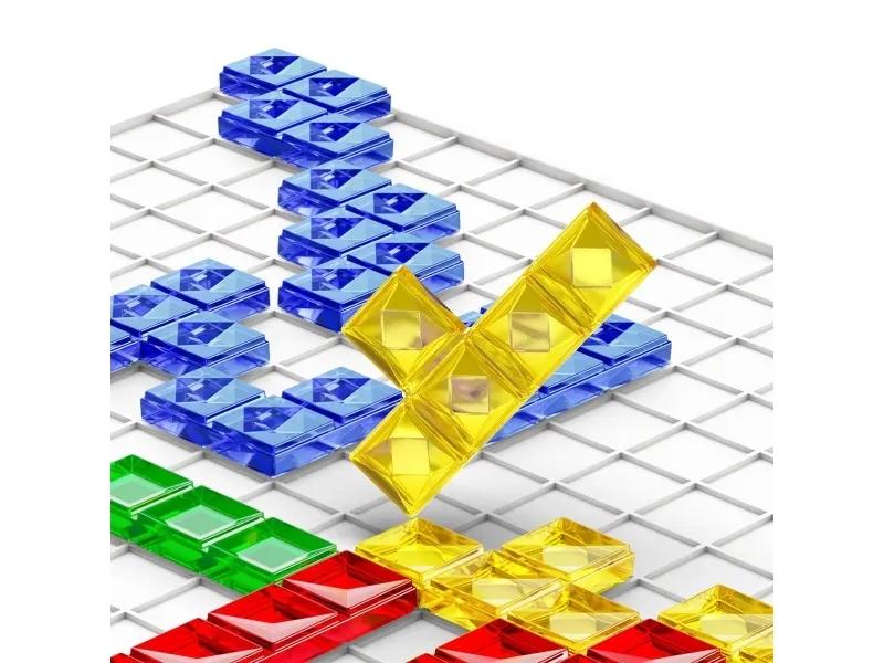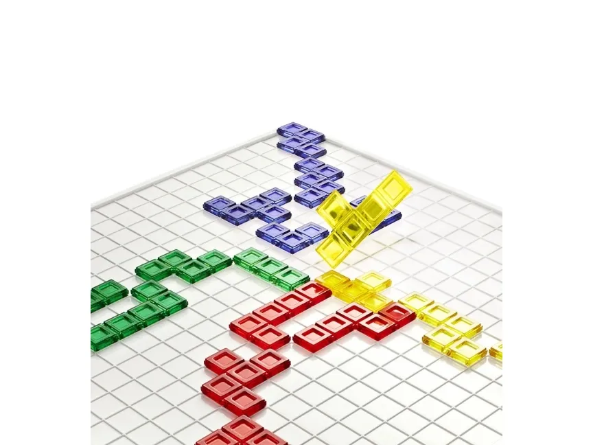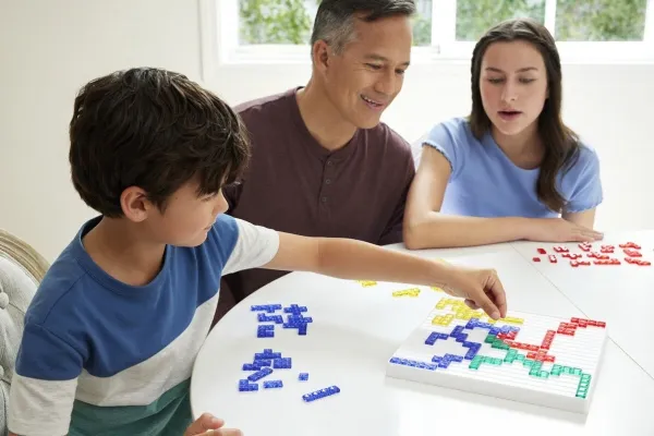 Fun for both kids and adults, Blokus is a strategy board game that challenges spatial thinking. The goal of this game is for players to fit all of their pieces onto the board. When placing a piece it may not lie adjacent to the player's other pieces, but must be placed touching at least one corner of their pieces already on the board. The player who gets rid of all of their tiles first is the winner and strategic thinking helps!